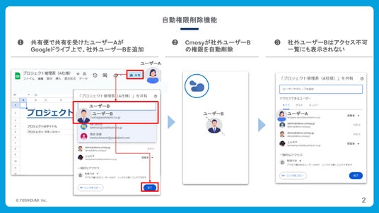 吉積情報株式会社(本社:東京都千代田区、代表取締役社長:秋田晴通、以下、吉積情報)は、Google ドライブの外部共有をより安全に・セキュアに実現する拡張サービス「Cmosy」のファイル便送信容量無制限化など、新機能を多数リリースいたしました。