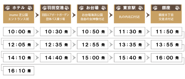 羽田空港、東京駅などターミナルのほかに、愛犬連れの観光やお買い物に便利なお台場、銀座を周遊します。国土交通省 交通・観光連携型事業