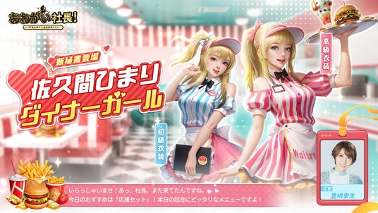 会社経営シミュレーションゲーム「おねがい社長!」に新規秘書、ダイナーガール 「佐久間ひまり(CV:豊崎愛生)」が2025年7月5日(土)から登場します。CV公開記念の抽選イベントも開催されますので、ぜひお見逃しなく!