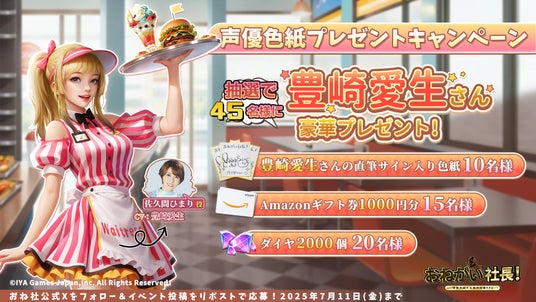 抽選賞品:豊崎愛生さん直筆サイン入り色紙×10名様、Amazonギフト券1000円分×15名様、ゲーム内アイテム「ダイヤ2000個」×20名様