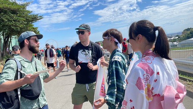 本企画では、学生たちにこれまでに習得したマーケティングの知識や語学がどこまで実践で通用するかを試す場を与えたいという想いのもと、学生を募集し10名を選抜。学生のキャリア支援を手掛けるNPO法人鴻鵠塾(こうこくじゅく)と連携の上、同大会を運営するホンダモビリティランド様に企画を提案し、連携・実現に至りました。学生たちは日頃鍛えている語学を駆使しつつ、日本らしさを表現するため、着物や浴衣を着て案内業務やインタビューを実施しました。
