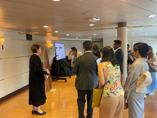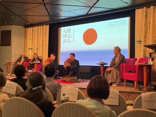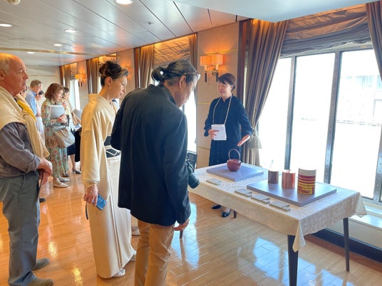 2024年6月3日(月)、米国ニューヨークに寄港する客船「飛鳥II」(※1)の船内で一般社団法人TAKUMI Art du Japon主催の文化・芸術関係者向け日本文化発信イベントが開催されました。MUFGは本イベントに協賛し、「MUFG工芸プロジェクト」として工芸品の船内展示(※2)を行いました。イベントでは、元文化庁長官の近藤誠一氏と人間国宝の2名、室瀬和美氏(蒔絵)と大倉源次郎氏(能)、およびメトロポリタン美術館の日本学芸員であるMonika Bincsik氏による鼎談のほか、室瀬氏による解説のもと船内で展示されている工芸品を紹介する船内ツアーを実施しました。