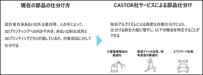 現在では多くの場合、既存の製品に対して3Dプリンティングを適用する際には、人の判断で対象部品を選択し、3Dプリンティングの可否を決定し、場合によっては形状修正を加える等の作業を行っていますが、Castor社が独自に開発した高度なアルゴリズムを適用することにより、例えば一製品を構成する数千の部品から成るBOM(Bill Of Material:部品表)およびCAD(Computer Aided Design)図面から、3Dプリンティングに適した部品を自動的に特定する、あるいは3Dプリンティングに適した形状への修正提案を受けることができます。さらに、解析した部品の製造リードタイム、コストおよびCO2排出量を算出することによって、お客さまの製造プロセスの最適化に貢献します。