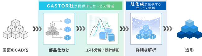 当社は、エンジニアリングプラスチック製品を中心とした樹脂CAE※(Computer Aided Engineering)技術サービスにより、お客さまの製品の設計開発を総合的にサポートしてきました。当社の樹脂CAE技術サービスはその精緻さに定評があります。今後さらにお客さまの時間軸で適切にご要望にお応えするという観点から、CASTOR社が提供するサービスである、簡便な部品成立性・製造コストのシミュレーションに着目しました。CASTOR社が提供するサービス・ソフトウエアは当社が提供する樹脂CAE技術サービスの前工程にあたり、当社の技術とかけ合わせることで、より高度なシミュレーションを自動化できる可能性を秘めています。このたび、CASTOR社への出資を通じてさらなるCASTOR社の技術理解を深め、両社のサービス拡張に向けたPoC(概念実証)を進めてまいります。