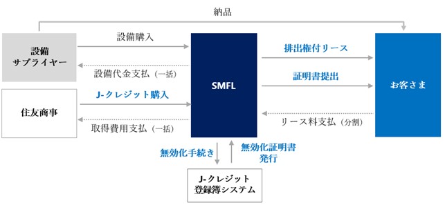 三井住友ファイナンス&リース株式会社(代表取締役社長:橘 正喜、以下「SMFL」)は、住友商事株式会社(代表取締役 社長執行役員 CEO:兵頭 誠之、以下「住友商事」)から購入したJ-クレジット※1をリース契約に付加し、対象物件のリース期間中に見込まれるCO2排出量を相殺する「排出権付リース※2」(以下「本商品」)のサービスを開始したことをお知らせします。