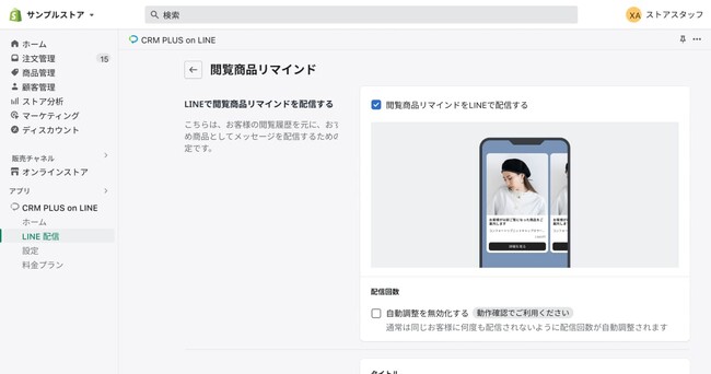 閲覧商品のリマインド配信機能は、現時点ではShopifyアプリ「CRM PLUS on LINE」Proプランからご利用可能です。ご利用可能プランは順次拡大予定です。