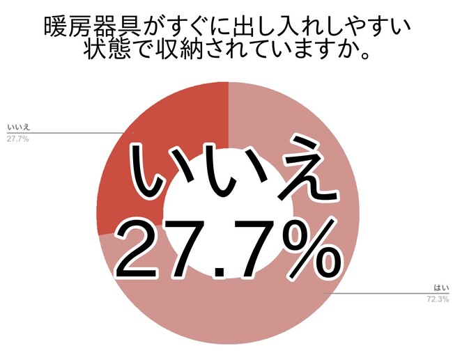 エアコンを中心とするメインの暖房器具にプラスして、コンパクトヒーターやホットマット・ホットカーペット等を活用して暖を取っている方が多いことが分かりましたが、これらはシーズンオフには収納し、寒くなったら出して使う場合が多いと考えられます。そこでアンケートでは次に、暖房器具がすぐに出し入れしやすい状態で収納されているかを尋ねました。