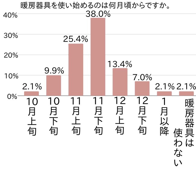 関東・全国とも、暖房を使い始める時期が「11月下旬(関東38.0%・全国31.5%)」が最も多く、次に多い「11月上旬(関東25.4%・全国27.0%)」と合わせて11月から使い始める方が約6割を占め最多(関東63.4%・全国58.5%)でした。