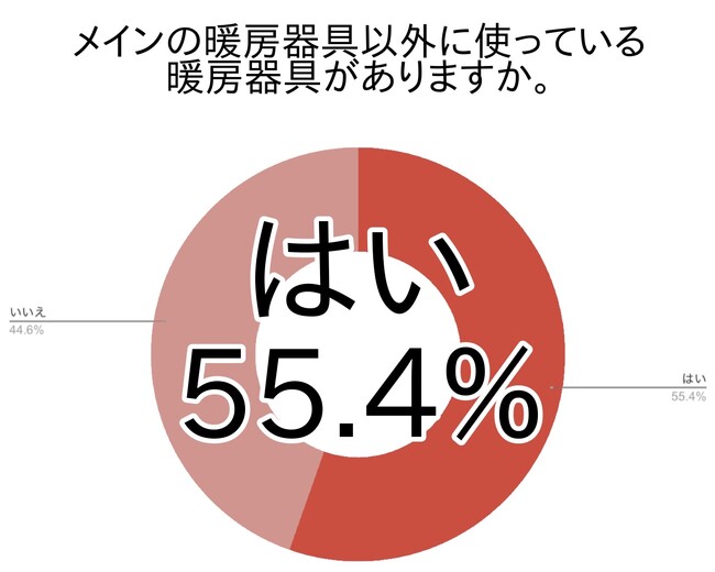 メインの暖房器具以外に使っている暖房器具があると答えた方は全国的に約6割(関東55.4%・全国63.5%)でした。半数以上の方がメインの暖房器具だけではなく複数種類の暖房器具を利用していることが分かりました。