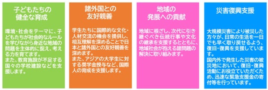 イオンワンパーセントクラブは、「お客さまを原点に平和を追求し、人間を尊重し、地域社会に貢献する」というイオングループの基本理念を具体的な行動に移し、社会的責任を果たすことを目的に、1990年に設立されました。以来30年以上にわたり、お客さまにイオングループをご利用いただいて生まれた利益の1%相当額をもとに、「子どもたちの健全な育成」「諸外国との友好親善」「地域の発展への貢献」「災害復興支援」を主な事業領域として、環境・社会貢献活動に取り組んでいます。