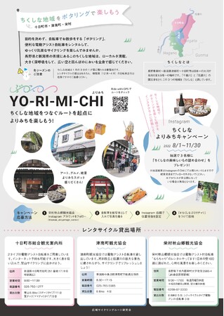 利用者はレンタサイクル等を利用し、メインルートを基点としながら、ゆっくりぶらぶらと“よりみち”をしながらポタリングをお楽しみいただけます。