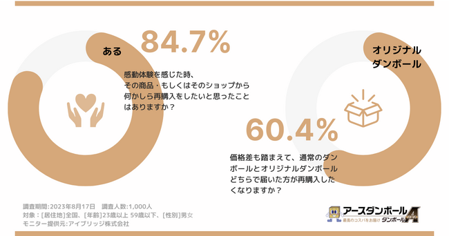 次に「ダンボールで感動したユーザー」がその商品を再購入したいと感じるかどうか調査したところ、なんとその割合は84.7%と、非常に高い結果となりました。