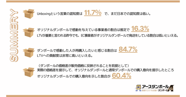 このことから、ダンボール(梱包材)はコストとしてでなく、LTVを向上させるためのマーケティングツールとして非常に高い可能性を秘めていると考えられます。
