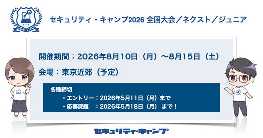 次代を担う日本発で世界に通用する若年層の情報セキュリティ人材を発掘・育成することを目指す一般社団法人セキュリティ・キャンプ協議会は、「セキュリティ・キャンプ2026 全国大会/ネクスト/ジュニア」を、2026年8月10日(月)~8月15日(土)までの5泊6日、東京近郊(予定)にて開催することを決定しました。これに伴い、2026年5月11日(月)まで参加者のエントリー受付を実施します。