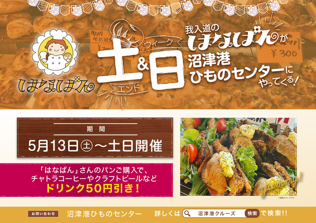浜友グループの株式会社千鳥観光汽船(本社:静岡県沼津市、代表取締役:後藤武彦)が運営する、ちどり沼津港ひものセンターは、長時間発酵のフランスパンが人気のパン屋『はなぱん』(所在地:静岡県沼津市)のパンを、2023年5月13日(土)より、毎週土日限定で販売いたします。