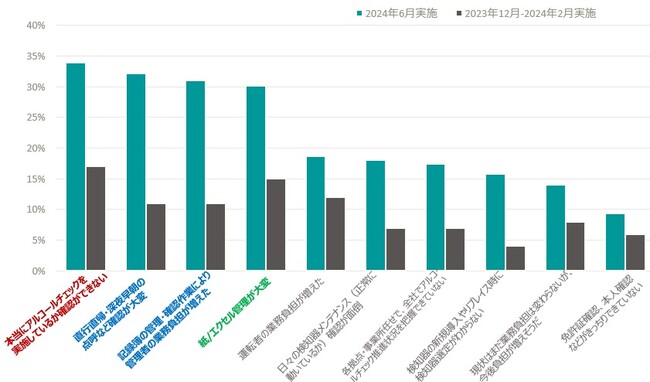 2. アルコール検知器使用義務化(2023年12月)以降の調査であり、安全運転管理者の課題感がより鮮明に。出張や直行直帰時の点呼、記録簿の管理などに関する業務課題が顕著に表れた。