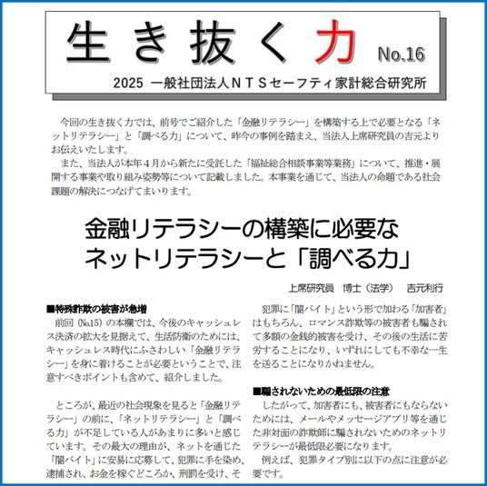 今回は、金融リテラシーを身につける上で大切な、「調べる力」「考える力」の必要性を論じた『金融リテラシーの構築に必要なネットリテラシーと「調べる力」』および当法人初の行政からの受託事業として、生活困窮者を対象とした相談窓口開設のご案内『家計相談から生活困窮者自立支援事業への飛躍!~八千代市とともに実現する福祉総合相談窓口のご紹介~』の二部構成となっております。是非ご一読ください。
