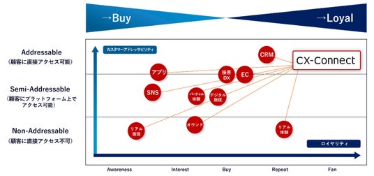 具体的な提供サービスとしては、企業・団体が自らの現在の状態・課題・優先順位などを把握するための独自の診断パッケージや、CX領域における100種以上のソリューションメニュー(独自ソリューション、外部ソリューションの両方を含む)を整備しています。これらを組み合わせることで、分散している個々の顧客体験をつなげ、ストック型マーケティング活動へと発展させていきます。一例としては、SNSをユーザーへの広告配信に使うだけではなく、SNS上で購買への導線を創り出し、そこで得たデータを蓄積・分析することでCRMツールへと発展させる、といったことなどが可能です。