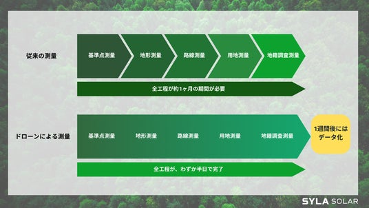 この提携により、土地の現地調査の精度と効率が大幅に向上しました。例えば、従来の手法では1ヶ月以上かかっていた山林の現況測量が、新たなICT技術であるドローンを活用することで、わずか半日で撮影が完了し1週間後にはデータで必要な情報を見る事ができるようになりました。さらに、ドローンによる地形調査とレーザースキャン技術を組み合わせることで、土地の形状や構造、地勢、木々の配置などを正確に把握できるようになりました。この技術革新により、従来の手法では活用が難しかった土地の一部を含め、より広範囲な土地を効果的に活用できるようになりました。これにより、太陽光発電所の開発に適した土地の選定や、設計段階での精度向上が可能となり、自然災害の影響を最小限にしつつ、全体の開発効率が飛躍的に向上します。