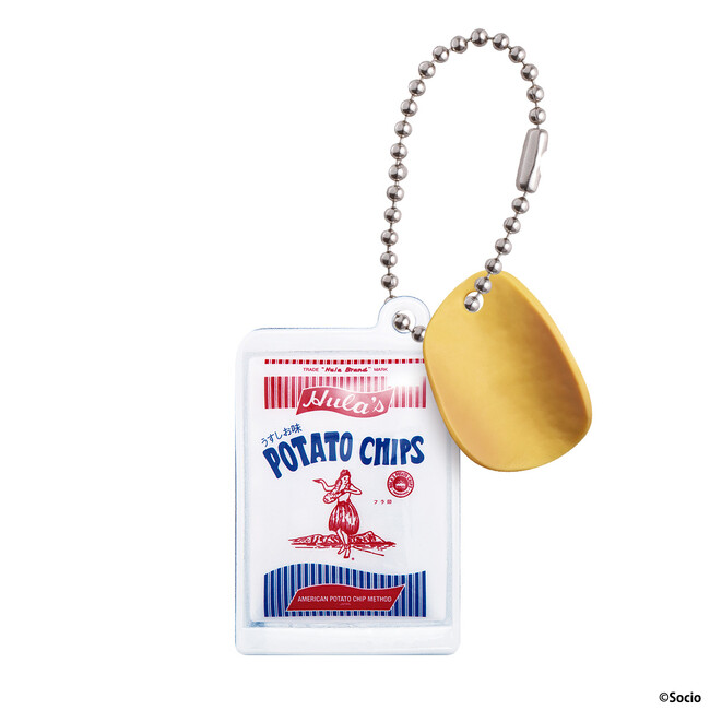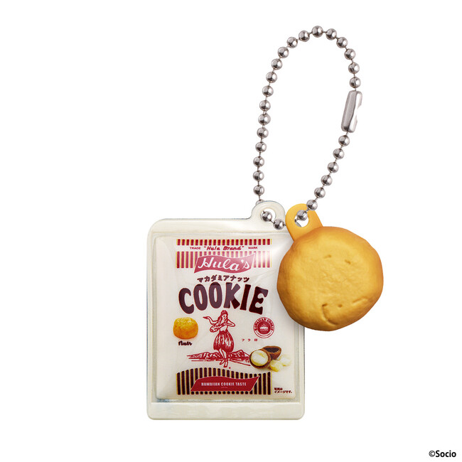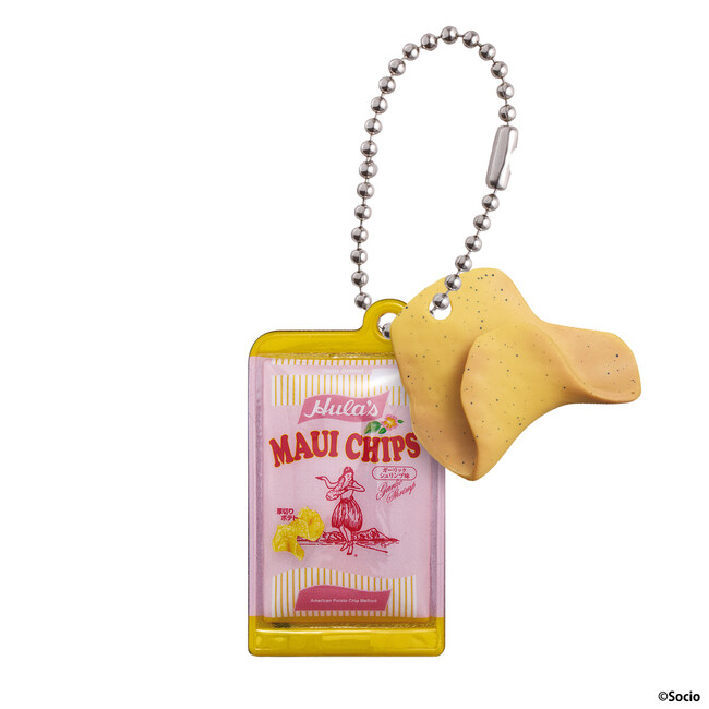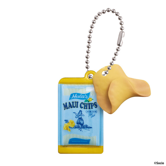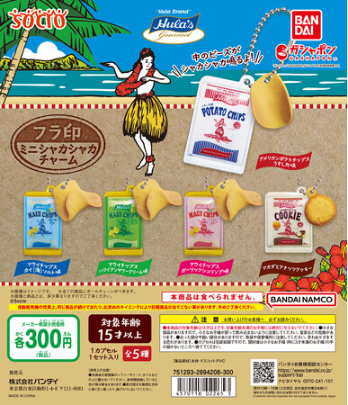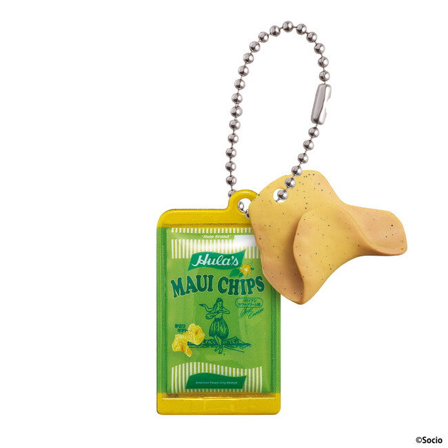 本商品は、フラダンスを踊るフラガールのパッケージがお洒落で印象的な「フラ印(Hula Brand)」の商品をミニチュアチャームで再現したカプセルトイ商品です。ラインナップはアメリカンポテトチップスからうすしお味、マウイチップスからカイ(海)ソルト、ハワイアンサワークリーム、ガーリックシュリンプの3味、そしてマカダミアナッツクッキーの全5種です。ハワイアンテイストのカラフルなパッケージを細かく再現していて、コンプリートして持ち歩きたくなるほど可愛いチャームになっています。お菓子を再現したチャームも付属したダブルチャーム仕様で、お菓子チャームは味によってデザインも変えていて、再現性を高めているのもポイントです。チャームの中にはビーズが入っていてシャカシャカできる仕様になっているので、ぜひお手元でお楽しみください。