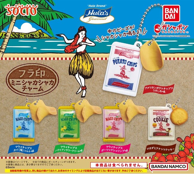 株式会社バンダイ ベンダー事業部(本社:東京都台東区)は、株式会社ソシオ工房(本社:東京都千代田区)の人気商品をミニチュアサイズで再現した「フラ印(Hula Brand) ミニシャカシャカチャーム」(1回300円・税10%込、全5種)を2023年10月第2週から順次、全国のガシャポンバンダイオフィシャルショップ、玩具売り場・量販店・家電店などに設置されたカプセルトイ自販機にて発売いたします。