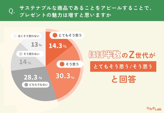 「サステナブルな商品であることをアピールすることで、プレゼントの魅力が増すと思いますか」という質問に対しては、「とてもそう思う」「そう思う」と回答した人が44.6%にのぼり、全体のほぼ半数を占めました。
