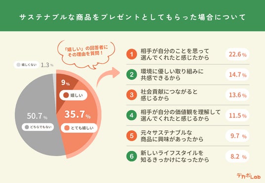 調査では、「サステナブルな商品をプレゼントでもらったら嬉しい」と回答した人のうち、最も多かった理由が「相手が自分のことを思って選んでくれたと感じるから」(22.6%)というものでした。