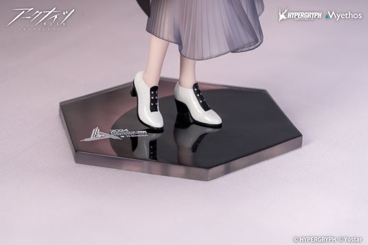 ロドス・アイランドのエリートオペレーターであるロゴスは、ドレープ感のある優美なロングコートに身を包み、黒のコートに映える白のジャケットとレザーボディーハーネスがその美しいシルエットを際立たせます。白から淡いブルーへと変化するグラデーションが施されたリボンが腕にふわりと絡み、黒革のグローブをはめた右手には骨筆を携え、まるで舞台の律動を呪文で再構築するかのような佇まい。背まで届く銀髪と冷徹な眼差しは、沈黙の契約をドクターに告げるようです。
