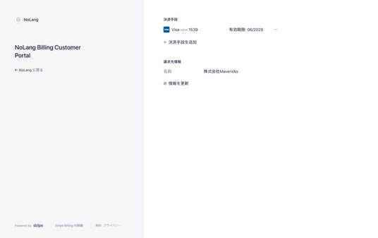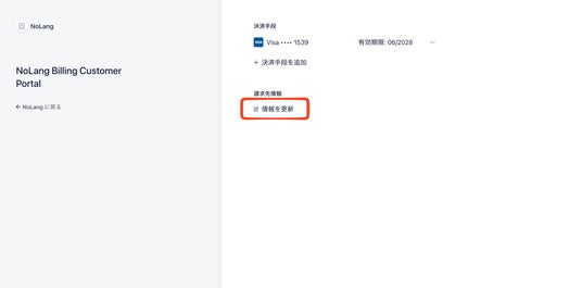 NoLangにログイン後、「マイページ」内の「プラン情報」タブを開きます。画面右下にある「支払い情報更新」ボタンをクリックしてください。