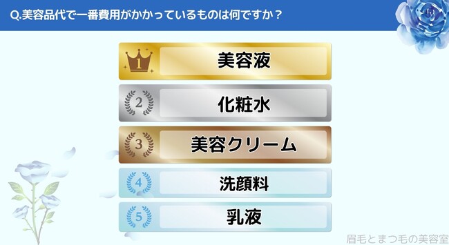 美容品代で一番費用がかかっているものをお聞きしたところ「1位>美容液」、「2位>化粧水」、「3位>美容クリーム」、「4位>洗顔料」、「5位>乳液」という結果になりました。