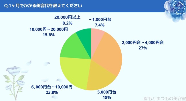 1ヶ月でかかる美容代をお聞きしたところ「1,000円台(7.4%)」、「2,000円台~4,000円台(27%)」、「5,000円台(18%)」、「6,000円台~10,000円台(23.8%)」、「10,000円~20,000円(15.6%)」、「20,000円以上(8.2%)」という結果になりました。