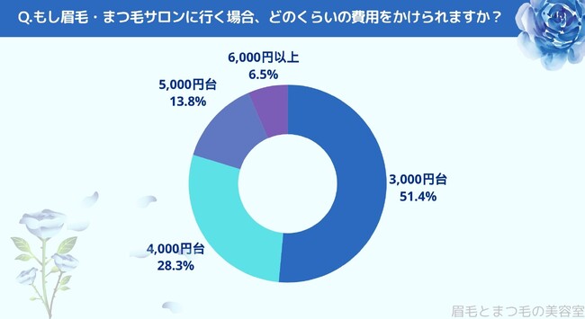 もし眉毛・まつ毛サロンに行く場合、どのくらいの費用をかけられるかお聞きしたところ「3,000円台(51.4%)」、「4,000円代(28.3%)」、「5,000円台(13.8%)」、「6,000円以上(6.5%)」という結果になりました。