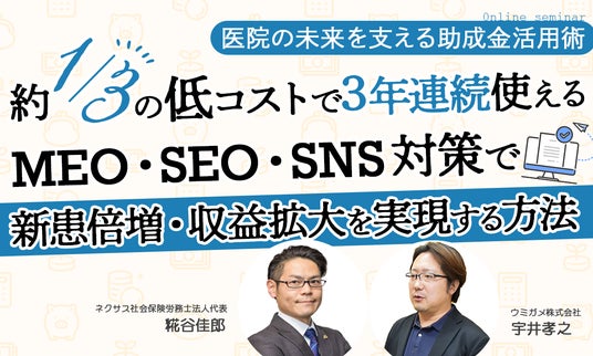 医院の未来を支える助成金活用術!約1/3の低コストで3年連続使えるMEO・SEO・SNS対策で新患倍増・収益拡大を実現する方法日時:10月8日開催