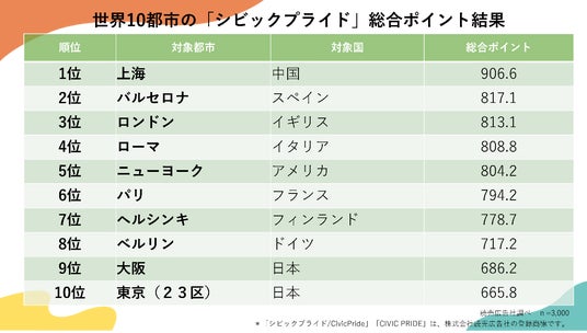 対象都市のなかで、「シビックプライド」の総合ポイント*が最も高かったのは「上海」となった。以降、「バルセロナ」「ロンドン」と続き、日本は「大阪」9位、「東京」10位と対象都市のなかでは低い評価となった。