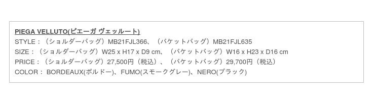光沢のあるベルベット素材を使用することでプリーツによる陰影が際立ち、シックで上品な装いになりました。すっきりとした横長シェイプのショルダーバッグと、間口を絞るところんとしたシルエットになるバケットバッグの2型です。柔らかさを感じさせるシックなニュアンスカラーのダークグレー、深みのあるフェミニンな印象のボルドー、素材の美しさが活かされた気品あるブラックの3色展開です。