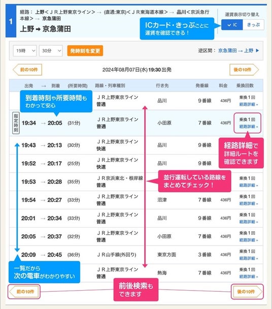 この区間形式の時刻表では、同じ区間で利用できる複数の路線をまとめて比較できるため、一本待って次の快速に乗ったらどうか、別の路線を利用したらどうかなど、急いで移動したい場合や、電車・バスに遅延が発生している際の迂回検索など、通勤・通学時の移動に役立ちます。