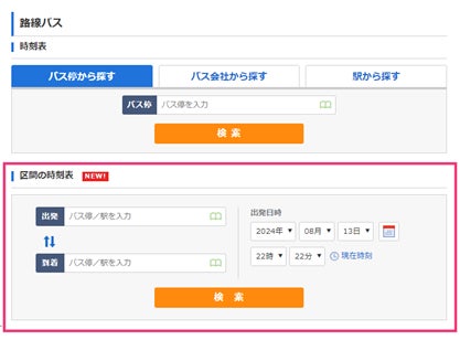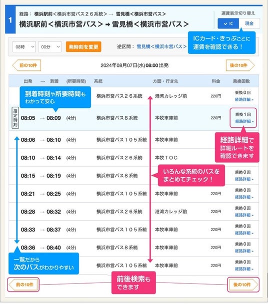 従来の時刻表は駅・バス停の発車時刻のみの案内でしたが、区間形式の時刻表では、職場や学校など、目的地の最寄り駅・バス停への到着時間を確認することができます。
