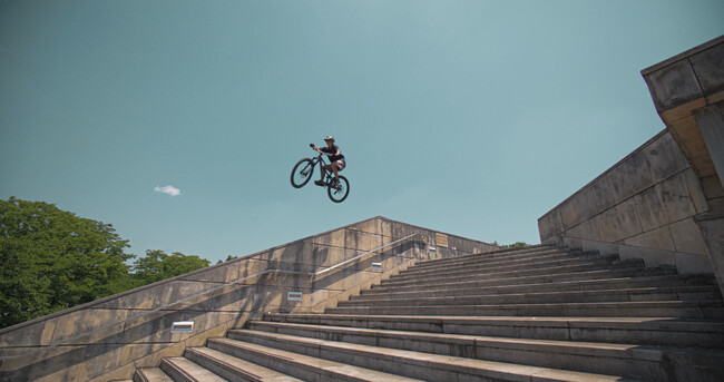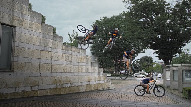 木村さんは、幼稚園の時に父親がジープで山の中の斜面や川を走っている姿を見てオフロードに興味を持ち、何か真似をして似たようなことができないかと考えた末にたどり着いたのが自転車でした。当時乗っていた子ども用の自転車で階段を降ったり、砂場を走っていたりしていたら、バイシクルトライアルをしているライダーに出会い、そこからトライアルにのめり込んでいきました。現在は、17歳で高校に通いながら、レースへの参戦、ショー出演、ストリートトライアルの動画作成を行なっています。