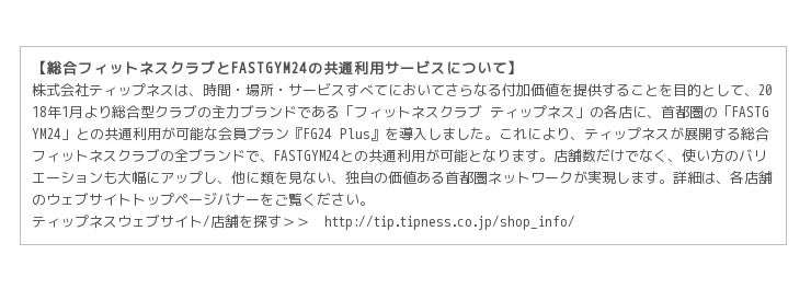 FASTGYM24は、ティップネスが首都圏を中心に展開するマシンジムをメインとした24 時間営業のトレーニングジムです。リーズナブルな月会費で「いつでも好きなときに好きなだけ利用できる」という手軽さと、利便性の高い鉄道沿線及び駅前への展開を特長としています。また、全ての店舗を利用できる会員種類も用意しており、多忙なビジネスパーソンや学生などさまざまな顧客層に受け入れられています。ティップネスは、今後も人々に充実したフィットネスライフを提供すべく、いつでも、気軽に運動できる環境を整え、ますますフィットネスを身近にしてきます。