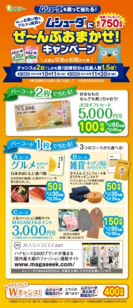 キャンペーンは、商品を購入した方が応募できるクローズドキャンペーンで、防虫剤「ムシューダ」や「かおりムシューダ」シリーズ、除湿剤「ドライペット」(シートタイプ)を対象に、8月1日から11月30日まで実施します。対象商品を2点購入し応募すると、JCBギフトカード5,000円分が抽選で合計100名様に、1点購入し応募すると、グルメカタログギフト「日本のおいしい食べ物」または雑貨・キッチン用品カタログギフト「タイムレスコンフォート&212キッチンストア」がそれぞれ抽選で50名様ずつ(合計100名様)に、そのほか、人気ファッション通販サイト「MAGASEEK(※)」のポイント3,000円分が抽選で合計150名様に当たります。