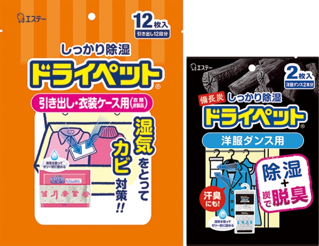 「ドライペット」シートタイプは、吸った湿気をゼリー状に固める除湿剤です。“引き出し・衣装ケース用”“クローゼット用”“洋服ダンス用”の3タイプをラインナップしています。