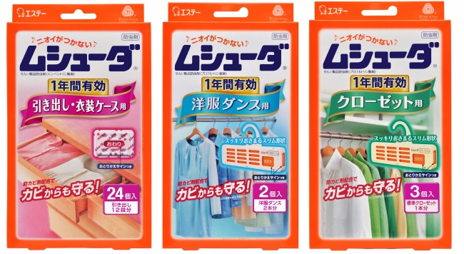 「ムシューダ」は、1988年の発売以降「ニオイがつかないムシューダ♪」のキャッチフレーズで親しまれている、大切な衣類を虫食いから守る安心の防虫剤ブランドです。“引き出し・衣装ケース用”“クローゼット用”“洋服ダンス用”やカバータイプの「ムシューダ防虫カバー」、「ムシューダ人形用」など幅広いアイテムをラインナップしています。