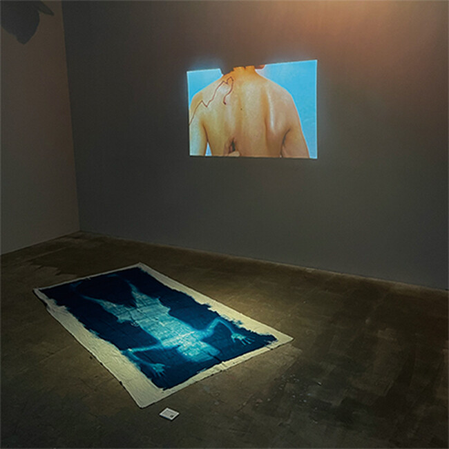 作品の制作手段としてデジタル技術を利用しながらも、この世の不確実性や無常をモチーフに映像インスタレーション作品を制作する。本展では「我々は自らの身体を所有している」という意識への疑いに、自らの身体を使って向き合った。
