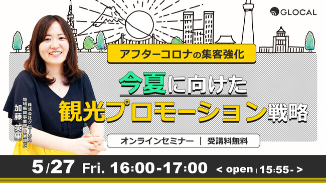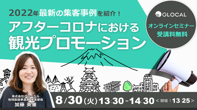地方自治体や地域の中小・中核企業を対象に経営コンサルティング事業を行う株式会社グローカル(東京都渋谷区、以下グローカル)は、地方自治体を対象に、アフターコロナの観光プロモーションついて解説する無料オンラインセミナーを、2022年8月30日(火)13:30から開催します。アフターコロナにおける観光プロモーションの変化を、2022年の最新事例を用いて解説します。