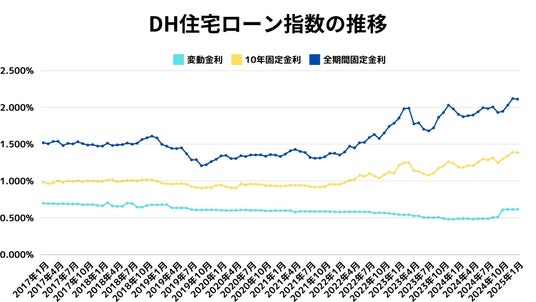 今月は、DH住宅ローン指数の10年固定は1.385%と前月の1.394%から下落した一方、1年前の1.188%よりも上昇しました。