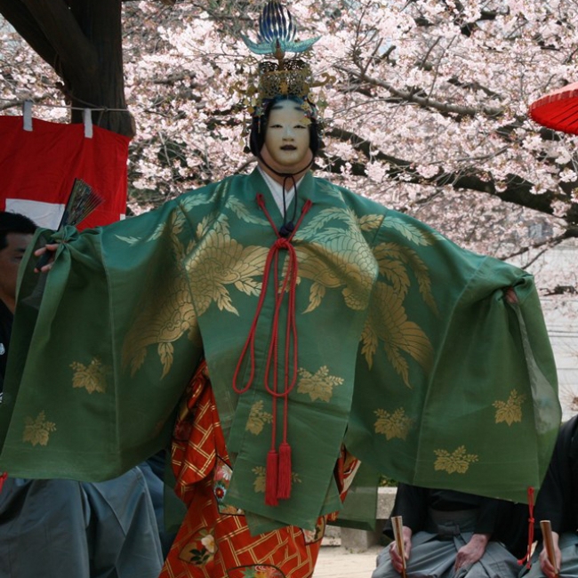 出演:山本能楽堂 シテ 山本章弘 大きな桜の前で、あでやかな舞をお楽しみください。