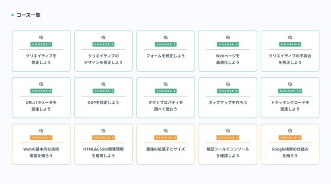 HTML&CSSを使ったクリエイティブ(Webページ)の修正、キャンペーンなどの際に活用できるポップアップの作成、OGPの設定、トラッキングコードやURLパラメータの設定など、様々なテクニカルスキルを身につけることが可能です。