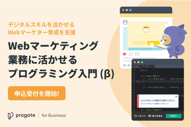 株式会社Progate(本社:東京都渋谷区、代表:加藤將倫、以下Progate)は、法人向けプログラミング学習サービス「Progate for Business」限定の最新コース「Webマーケティング業務に活かせるプログラミング入門(β)」の申込受付を開始したことをお知らせいたします。