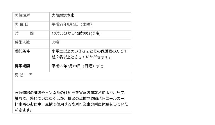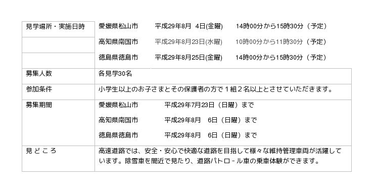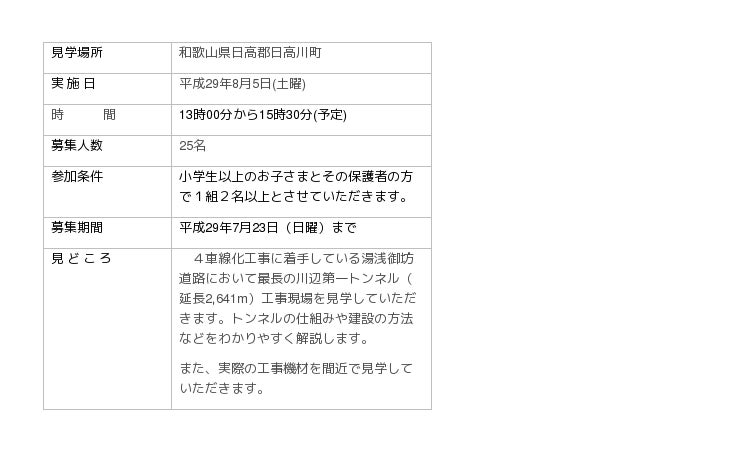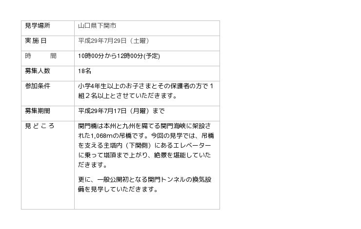 今回は夏休み企画として、関係者以外は立ち入ることのできない関門橋の塔頂に登っていただく体験や、高速道路の維持管理に活躍しているリフト車・パトロール車に乗っていただく体験の他、最盛期を迎えている高速道路の建設工事現場として、トンネル内を自動で移動して監視を行う自走式ロボットカメラなどの日本初となる最先端技術を用いた神峰山トンネルや、湯浅御坊道路の4車線化工事のトンネル掘削現場を初めて公開するなど、お子さまの夏休みの思い出、自由研究の題材としていただける親子現場見学会を開催いたします。