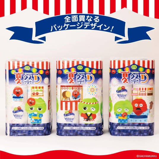 発売以来ご好評いただいております、ガチャピン・ムックデザインのシリーズより、『夏祭り』をテーマにしたトイレットペーパーを、期間限定で発売いたします。